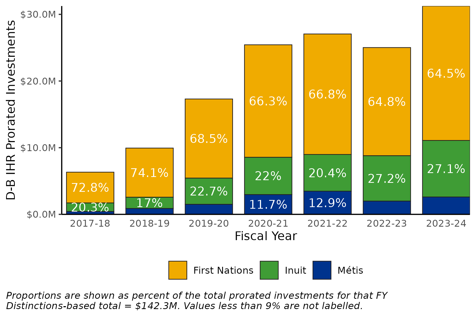 Proportions are a percent of the total prorated investments for that fiscal year. Distinctions-based total = $142.3M. (2017-18 - 2023-24)
