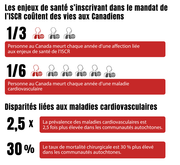 La mission de l'ISCR est de soutenir la recherche sur certains des problèmes de santé les plus pressants au Canada, y compris les maladies du cœur, des poumons, du cerveau (AVC), du sang, des vaisseaux sanguins ainsi que les soins intensifs et les troubles du sommeil.